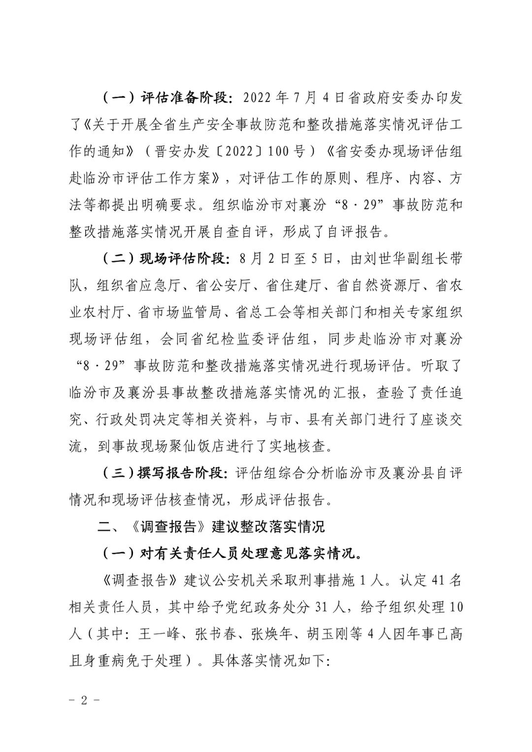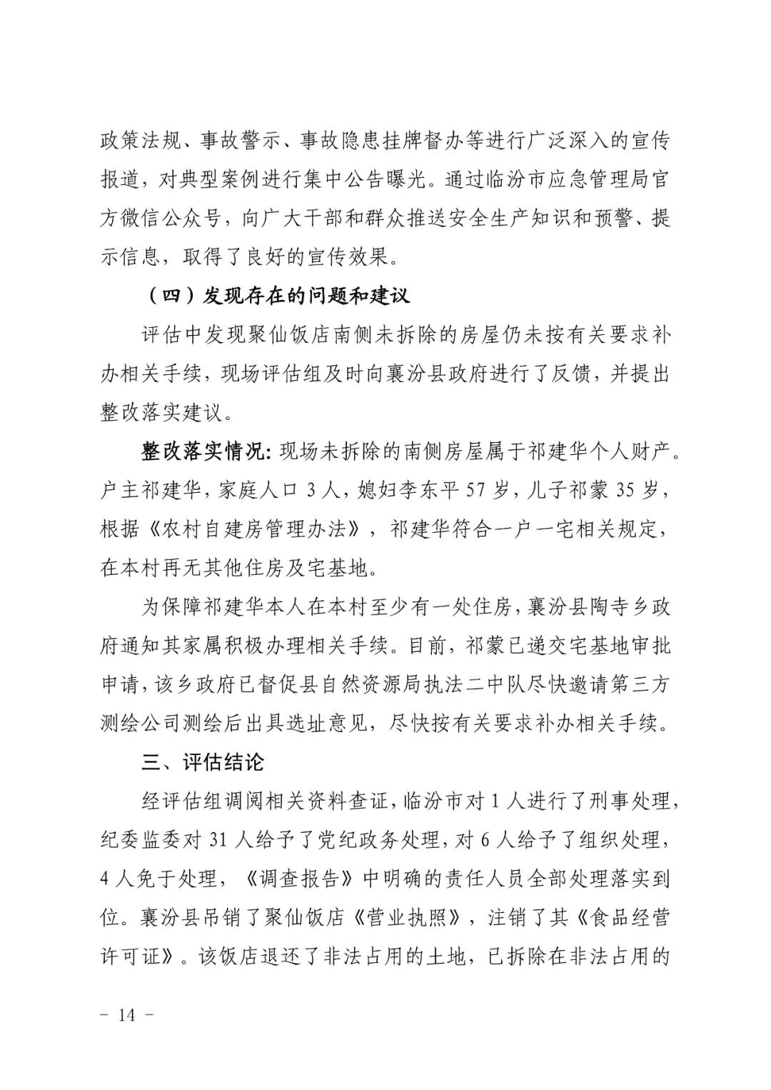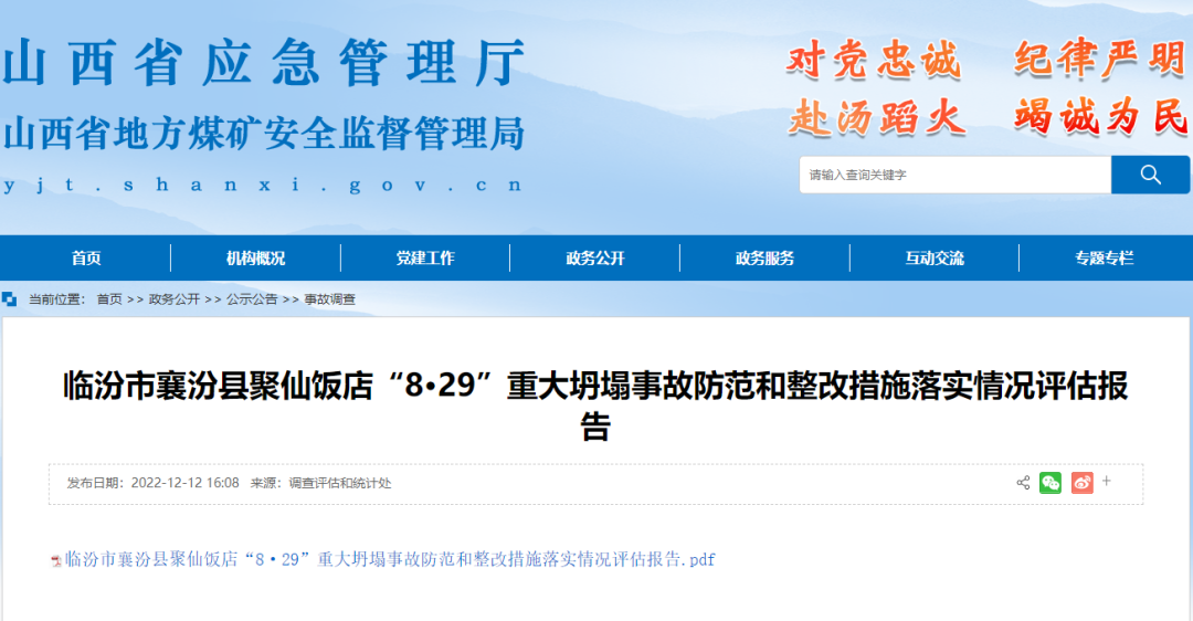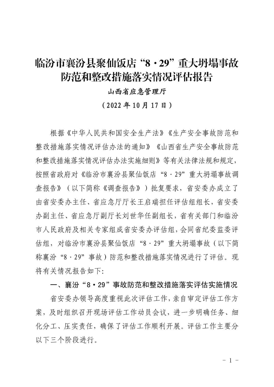 日前,山西省应急管理厅发布《临汾市襄汾县聚仙饭店“8·29”重大坍塌事故防范和整改措施落实情况评估报告》(以下简称评估报告)。
