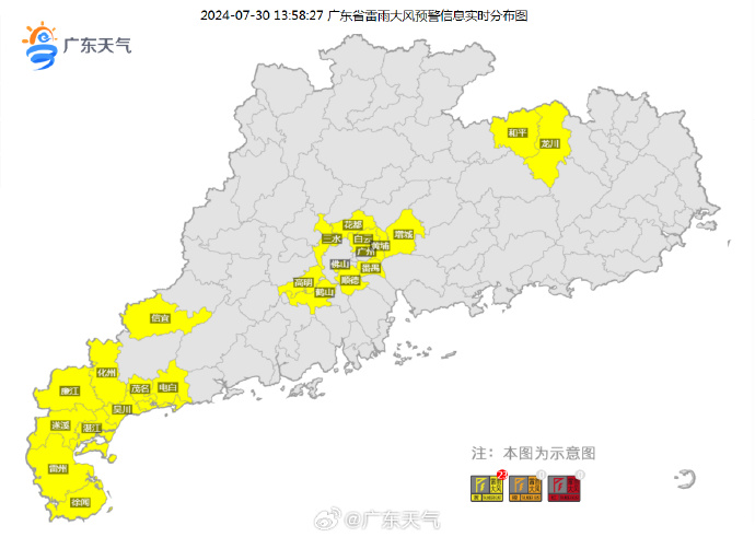 截至13时58分,台山、电白、茂名、遂溪暴雨橙色预警信号生效中;东莞、龙门、雷州等13个市县暴雨黄色预警信号生效中;全省共有23个雷雨大风预警信号生效中。