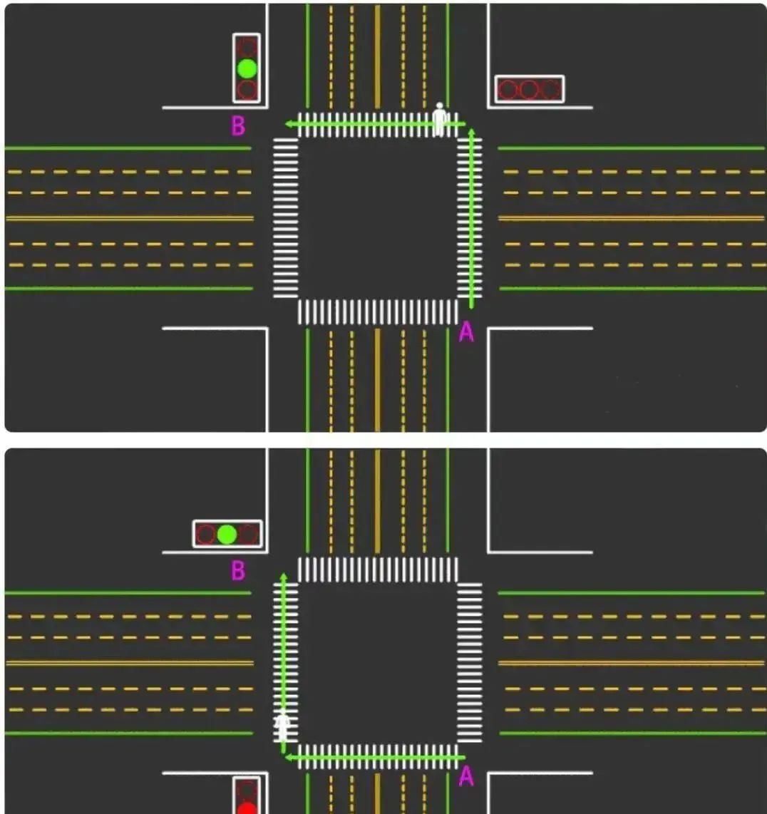 如果需要到路口斜对面,无论路口大小、无论有没有信号灯、斑马线,都应当“直角二次过街”,千万不要在车流中斜穿。
