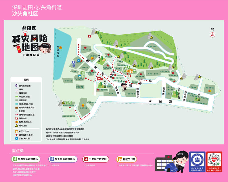 为进一步推动盐田区创建全国综合减灾示范区及示范社区,切实提升辖区民众防灾减灾意识,夯实基层防灾减灾救灾基础,盐田区减灾委办委托市安全研究院开展全域灾害风险宣传地图制作工作。“盐田区减灾风险地图”以“1张区级全域减灾地图”加“19张社区风险减灾地图”形式制作,形成了一套具有盐田山海特色的灾害风险宣传系列地图。同时,该地图融入了盐田应急形象IP,以漫画的形式,活泼生动的向群众展示全区避难场所、医疗救助点及灾害风险点等位置信息,同时为辖区群众指明临灾避险转移路线,以及在灾害来临时应该如何避险互助。